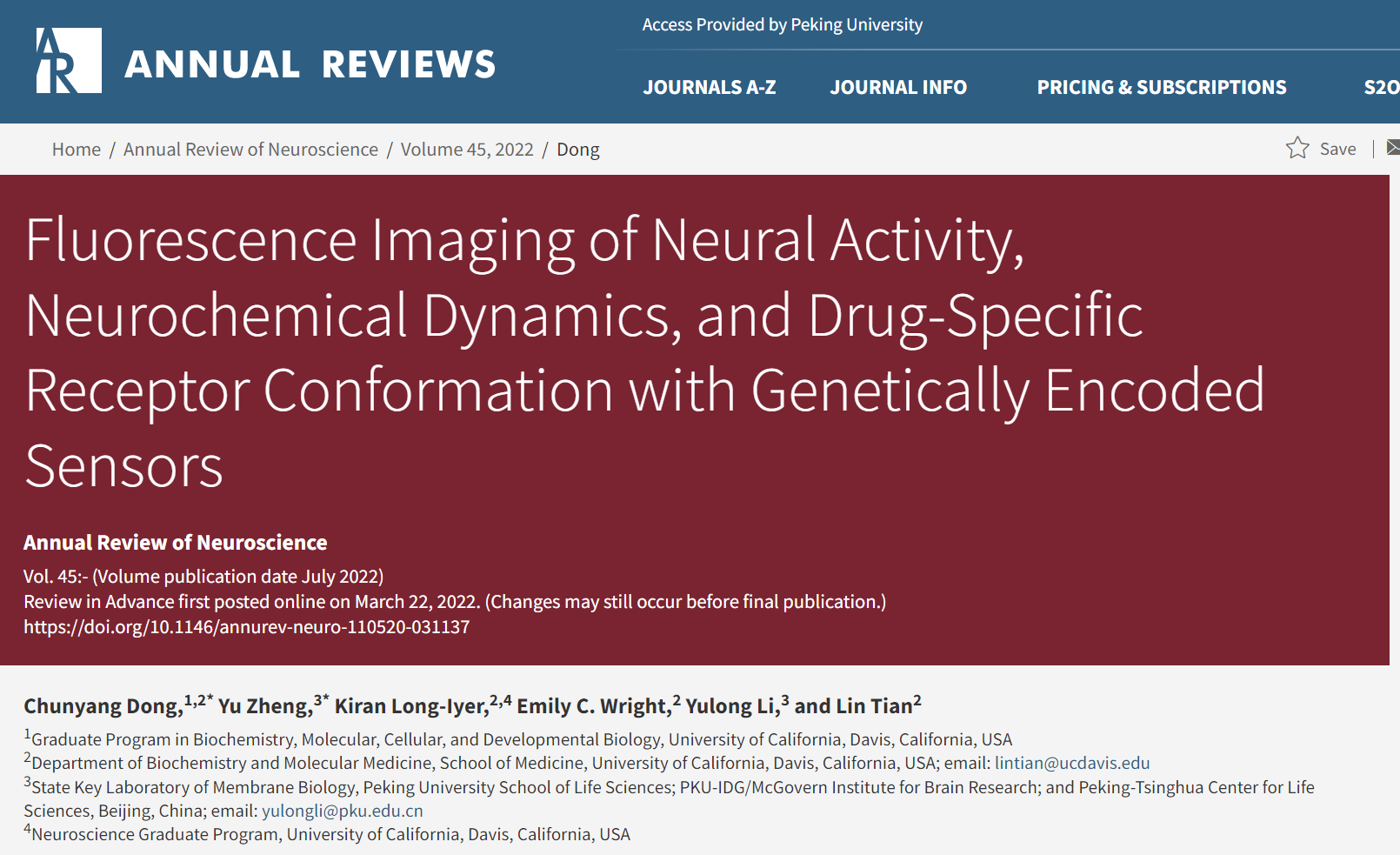 值得一提的是,2022年3月22日,李毓龙团队和美国加州大学戴维斯分校(UC Davis)的Lin Tian团队应邀在Annual Review of Neuroscience杂志合作撰写了题为“Fluorescence Imaging of Neural Activity, Neurochemical Dynamics, and Drug-Specific Receptor Conformation with Genetically Encoded Sensors”的研究综述。该综述系统介绍了基因编码荧光探针的发展历史与工作原理,并聚焦神经递质探针,讨论了其在神经科学研究与药物研发中的应用。与前一篇综述不同的是,这篇文章着重介绍了基因编码神经递质探针的开发流程,并建立了指导探针优化的理论模型。该研究综述的共同第一作者是UC Davis的博士生董春阳和北京大学生命科学联合中心博士生郑宇,通讯作者是李毓龙教授和Lin Tian教授;该研究综述相关的研究工作获得美国脑计划、北京市科委、国家杰出青年科学基金和腾讯基金会等基金的资助。