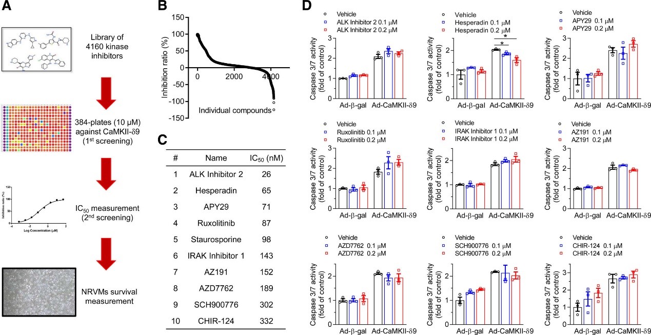 研究者首先建立了基于CaMKII激酶活性的高通量筛选系统,进而从具有4160个小分子激酶抑制剂库中筛选出一个以前被报道为Aurora kinase B抑制剂的小分子化合物Hesperadin,能够以ATP竞争的方式特异性的抑制心脏中最重要的CaMKII亚型,CaMKII的δ,而且与传统的CaMKII抑制剂KN-93相比,Hesperadin并不引起钾离子通道抑制的脱靶效应。
