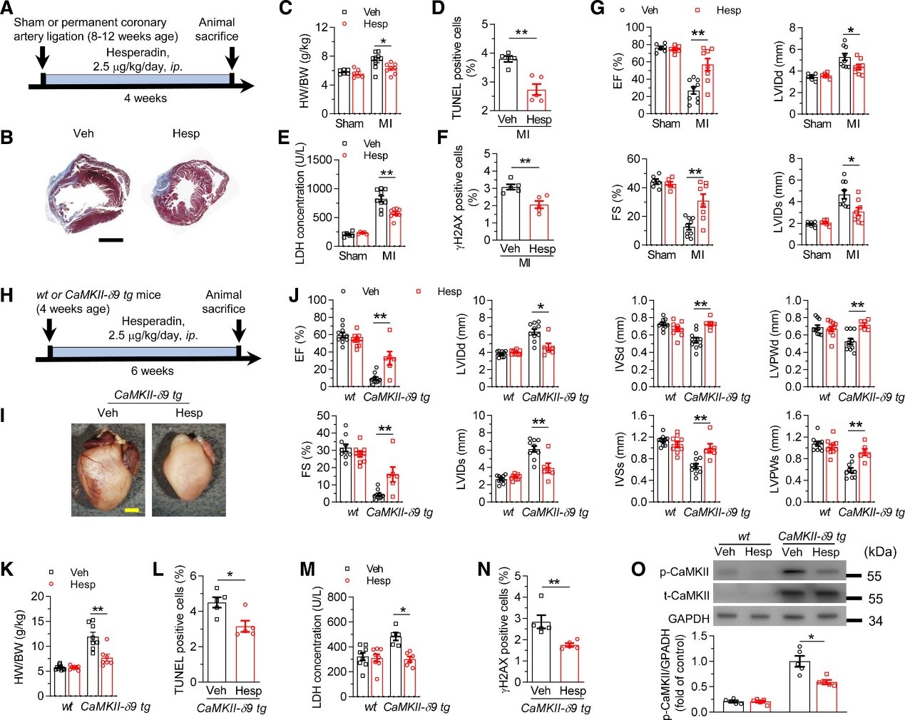 此工作首次揭示了Hesperadin是一种全新的CaMKII-δ选择性的小分子抑制剂,及其在缺血性心脏病和心力衰竭等重大疾病防治中的作用。研究提示,Hesperadin具有心脏保护和抗肿瘤双重作用,不仅表明Hesperadin是临床治疗心脏I/R损伤和心力衰竭的一种有前景的先导化合物,而且为抗癌治疗时引起心脏毒性,进而导致癌症和心血管疾病的联合治疗提供了新策略。