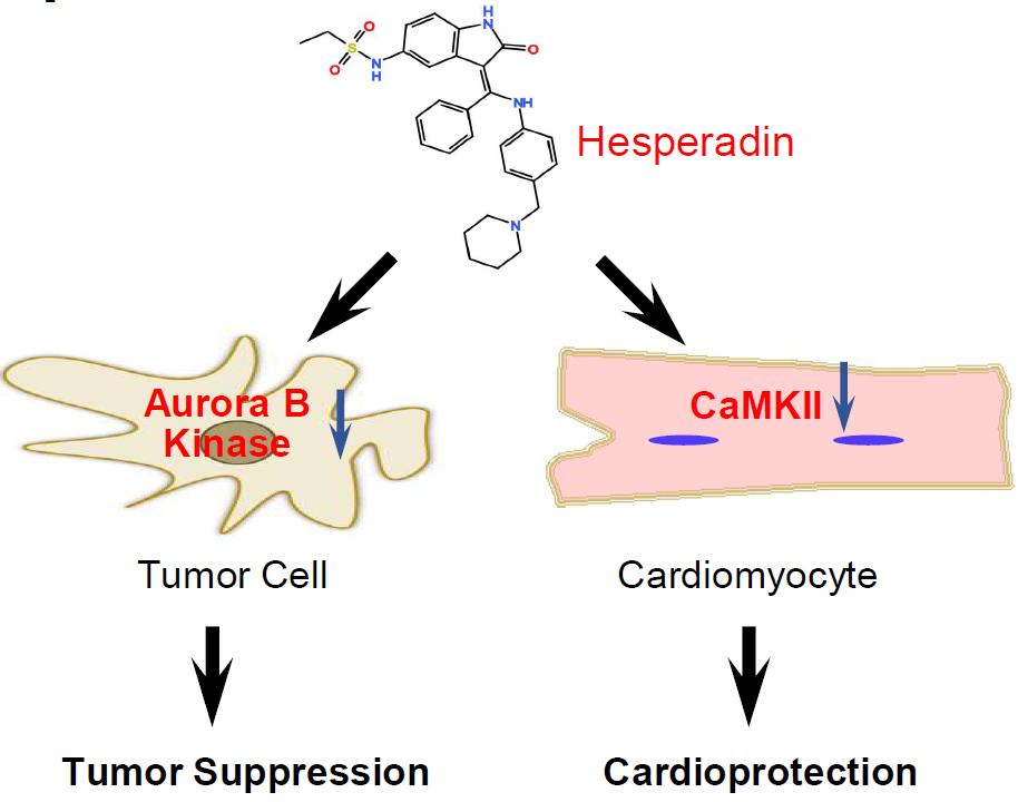 功能上,利用培养的大鼠新生心室肌细胞(NRVMs)、小鼠在体心脏I/R损伤模型、以及胚胎干细胞分化来源的人心肌细胞,作者发现Hesperadin能够保护心肌细胞死亡和相关心脏疾病。更加重要的是,Hesperadin在保护心脏的同时,还在体内和体外水平促进肿瘤细胞凋亡,抑制肿瘤生长,而不引起心肌细胞死亡或心脏损伤。Hesperadin在肿瘤和心肌细胞中不同作用的机制,主要是因为在肿瘤细胞中Hesperadin通过抑制Aurora kinase B发挥促凋亡、抑增殖的作用,但是心肌细胞是终末分化的细胞,不表达Aurora kinase B,因此在心肌细胞中,Hesperadin只作用于CaMKII,进而抑制心肌细胞死亡、保护心脏疾病。