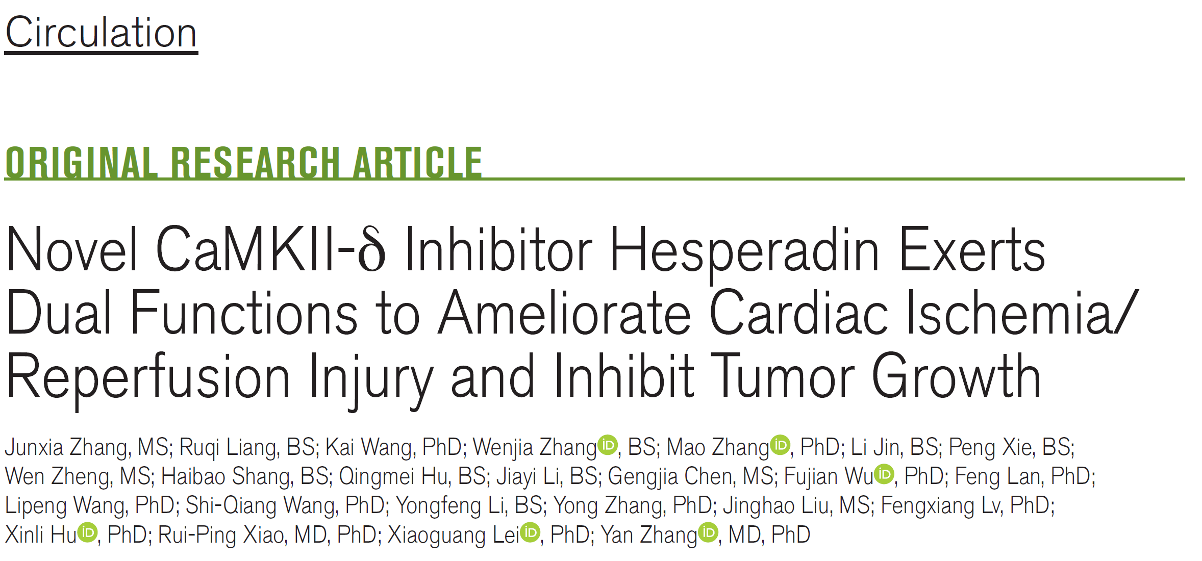 2022年4月12日,北京大学化学与分子工程学院,生命科学联合中心雷晓光课题组与北京大学医学部心血管研究所张岩课题组,以及北京大学未来技术学院,北大-清华生命科学联合中心肖瑞平课题组合作,在国际心血管领域顶级期刊Circulation上发表了题为“Novel CaMKII-δ Inhibitor Hesperadin Exerts Dual Functions to Ameliorate Cardiac Ischemia/Reperfusion Injury and Inhibit Tumor Growth”的研究论文,该研究基于高通量药物筛选以及后期的深入功能验证,发现了首个对CaMKII-δ激酶具有高活性和选择性的小分子抑制剂Hesperadin。在功能上,Hesperadin改善了啮齿动物和人胚胎干细胞衍生的心肌细胞中 I/R 和过表达的 CaMKII-δ9 诱导的心肌细胞死亡、心肌损伤和心力衰竭。