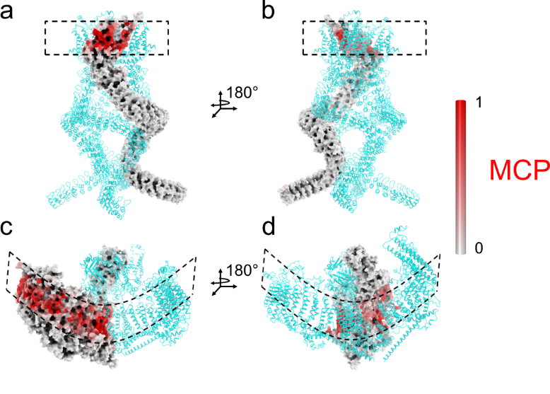 图2 膜接触概率在具体事例中的预测结果。膜接触概率根据数值大小以红色着色到蛋白结构表面。
