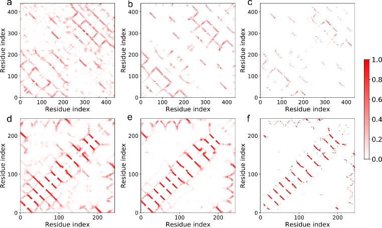 图4 在两个具体事例中蛋白质残基接触图的预测结果与相应真实结构的残基接触图。可见整合MCP信息后的接触图(b&e)比整合前(a&d)更接近真实结构接触图(c&f)。