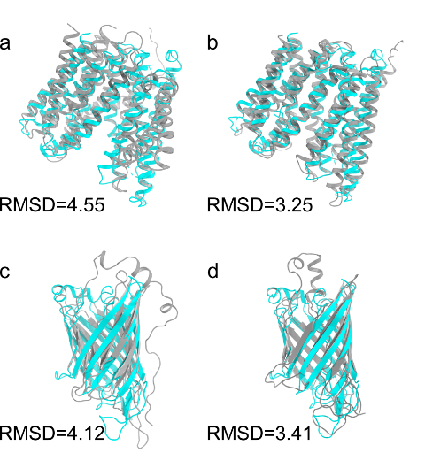 蛋白质残基接触图预测精度的提升很可能有助于蛋白质三维结构预测,对此作者也进行了初步验证。针对两个代表性的膜蛋白结构5aym(α螺旋跨膜蛋白)和4e1t(β桶状跨膜蛋白),基于预测得到的蛋白质残基接触图(图4)(整合膜接触概率后top L/5预测精度分别提高10%和6%),作者利用CONFOLD2 [8]构建了可能的蛋白质结构模型。结果表明,该方法在整合膜接触概率后给出了更加精确的预测结构,符合预期(图5)。