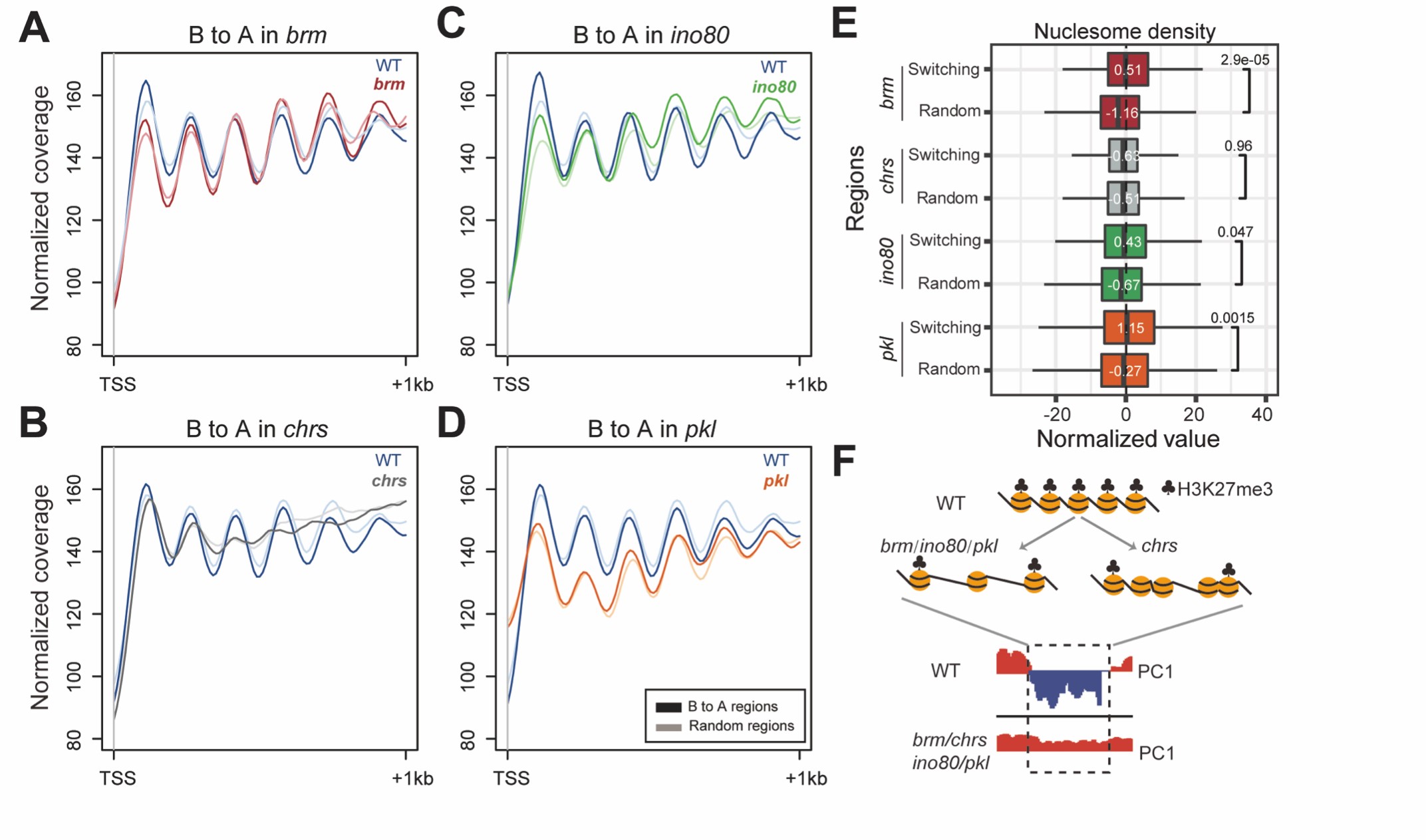 周岳课题组收集了拟南芥4类保守的染色体重塑复合体ATPase催化亚基的突变体,通过遗传学和多组学方法分析了这4类核心亚基突变体的染色体3D结构。研究结果显示4类不同的染色质重塑复合体的突变体都展现了染色质区室翻转的现象,同时区室强度也显著降低。染色质区室的转变主要发生在B区室向A区室翻转,突变后的4类染色质重塑复合体在染色体臂都形成了连续的A区室。进一步的分析发现翻转的B区室富集H3K27me3修饰,且H3K27me3水平在4类不同的染色质重塑因子突变体内的区室翻转区域有显著降低。通过对比H3K27me3完全消除的突变体,发现高水平的H3K27me3修饰可以阻止区室发生翻转。为了回答染色质重组复合体如何维持H3K27me3水平,通过MNase-seq检测了核小体的密度和分布。研究数据表明4类不同的染色质重塑复合体通过维持核小体密度和调控核小体分布,影响H3K27me3水平,进而阻止染色体区室翻转(图一)。