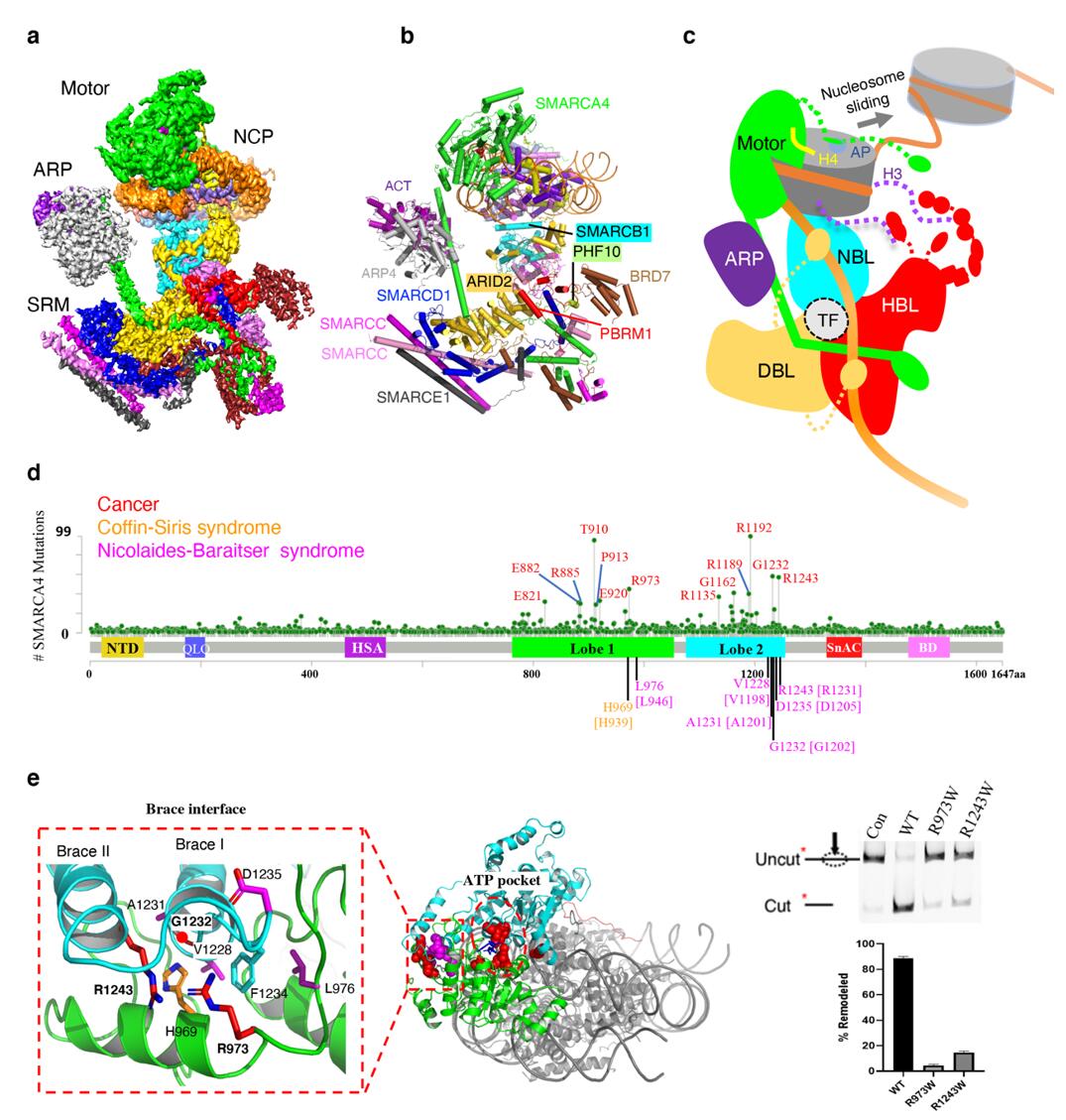(a)PBAF-核小体复合物的冷冻电镜密度图。(b)PBAF-核小体复合物的结构模型。 (c)PBAF复合物识别核小体,调控染色质结构的模型。(d)癌症及神经系统发育缺陷综合征相关相关的SMARCA4/2的错义突变位点分布(数据来自COSMIC,cBioPortal和已发表文献)。以SMARCA4序列为参考,标记高频突变位点;SMARCA2突变的对应氨基酸残基在[]里。(e)疾病相关的突变位点主要位于“ATP pocket”周围和“Brace interface”,局部放大图显示了高频突变位点在Brace-helix界面的分布,右图生化实验显示R973和R1243的突变大大降低了染色质重塑活性。