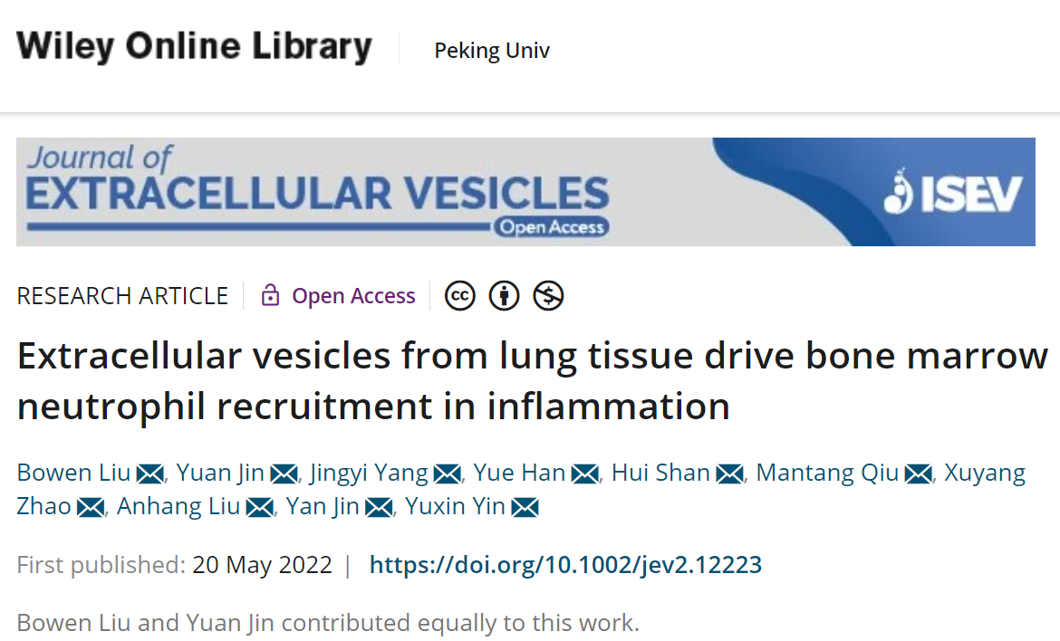 2022年5月20日,生命中心、北京大学基础医学院尹玉新团队在【Journal of Extracellular Vesicles, IF=26】杂志上在线发表了题为“Extracellular vesicles from lung tissue drive bone marrow neutrophil recruitment in inflammation”的研究论文。该研究使用新开发的方法鉴定并表征了从人和小鼠肺组织中收集含有dsDNA 的细胞外囊泡(EVs),并揭示了其在免疫过程中发挥的重要作用。