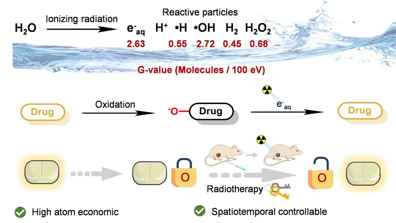 在临床中,联合放化疗是超过50%癌症病人的一线治疗方案。但是,受限于传统化疗药物较强的毒副作用,治疗效果有待提高。发展肿瘤选择性的化疗前药激活策略是解决上述问题的关键,同时也是药物研发领域一个长期存在的挑战。与其它激活手段相比,核辐射(如X射线、伽马射线等)能够精确地穿透深层组织,具有高时空分辨的优势,临床相关性也很强。水辐射分解可以产生多种活性化学物种,其中产额最高的是羟基自由基和水合电子。在2020年,刘志博课题组首次报道了核辐活体剪切化学(Angew Chem Int Ed, 2020, 59, 21546),该工作是基于羟基自由基的原位氧化反应。随后,爱丁堡大学的Bradley课题组在2021年报道了基于氢自由基的辐射剪切化学(Nat Chem, 2021, 13, 805)。然而肿瘤的乏氧和还原性环境中水合电子的产额增加,发展水合电子介导的活体化学有利于提高前药激活的效率。