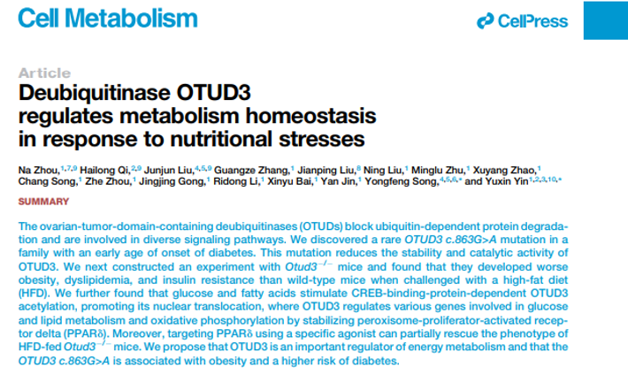 综上所述,这项研究发现新的与肥胖及糖尿病发病相关的关键致病基因OTUD3,揭示了OTUD3蛋白功能相关的新的能量代谢调控机制,为寻找肥胖及糖尿病的潜在治疗靶点提供了新的线索。