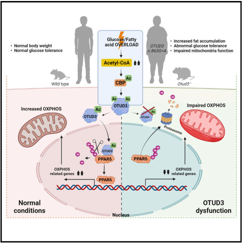实验研究发现OTUD3 c.863G>A突变可以大幅降低OTUD3的去泛素化酶活性以及蛋白自身稳定性。为证明该基因是否与MODY遗传性糖尿病发病相关,团队构建了Otud3基因敲除小鼠,研究显示Otud3基因敲除小鼠出现代谢紊乱及高脂饮食诱导的肥胖形成胰岛素抵抗等糖尿病早期特征,表明OTUD3的去泛素化酶功能缺失会引起肥胖并增加糖尿病发生风险。进一步研究证实,OTUD3可感知机体的能量状态,动态调整在细胞质和细胞核中的分布,进而维持能量平衡,从而抑制肥胖发生。机制探索表明,在葡萄糖或脂肪酸刺激下,乙酰转移酶CBP感知糖脂代谢产生的乙酰辅酶A将OTUD3乙酰化,促使OTUD3转运入细胞核,切除以PPARδ为代表的多种与能量代谢相关的转录因子的泛素链,减缓这些转录因子的降解,延长其发挥功效的时间,以此维持细胞能量代谢的活性。然而当OTUD3功能出现障碍时,以PPARδ为代表的多种与能量代谢相关的转录因子的稳定性降低,难以维持细胞正常的能量代谢,进而导致肥胖、糖尿病发生。此外,该团队还通过CHIP-Seq联合RNA-Seq实验鉴定了OTUD3可能调控的转录因子,验证了去泛素化酶调控多个具有类似功能的底物并发挥强大的功能。同时将经典的去泛素化酶调控底物蛋白的稳定性拓宽到基因调控层面。