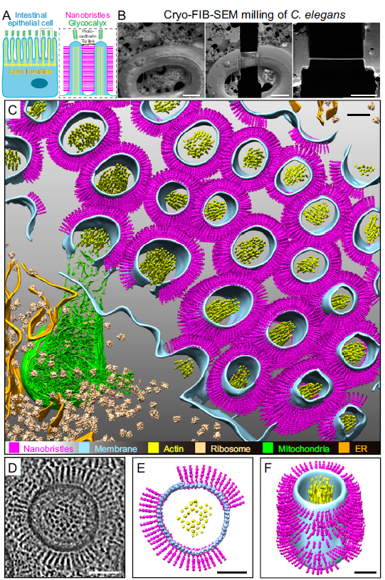 图 1. 对秀丽隐杆线虫肠道刷状边缘进行原位冷冻电子断层成像实验,发现微绒毛侧表面有纳米毛。