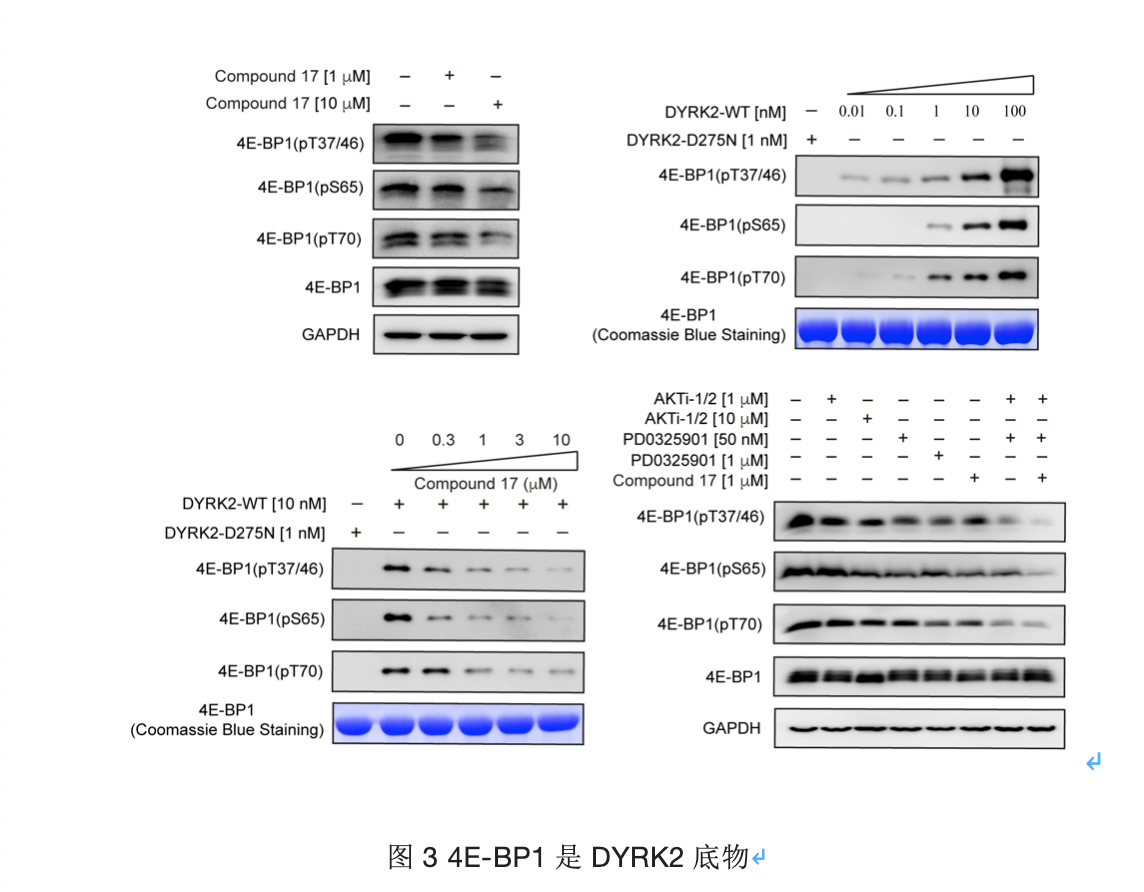 4E-BP1是转录过程的重要调节因子,已有研究表明是DYRK2的潜在底物(Wang et al., 2003)。本研究通过建立体外激酶活性体系,验证了DYRK2可以直接磷酸化4E-BP1上的多个位点(包括质谱鉴定到的位点Thr37),并且C17以剂量依赖性的方式抑制这些位点。此外,4E-BP1受多种激酶的共同调节,进一步研究表明,当C17与AKT、MEK抑制剂联用时,可以更高效地抑制蛋白磷酸化水平,表现出不同抑制剂之间的协同效应。总之,通过大量的体内外实验验证,结果表明4EBP1是DYRK2的直接底物,并揭示了DYRK2 抑制剂与其他激酶抑制剂联合用于癌症治疗的潜在用途。