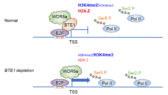 邓兴旺实验室朱丹萌课题组在对于植物特有非编码RNA HID1的研究中,发现拟南芥中HID1基因座下游1.8 kb的位置存在一个功能冗余的同源基因HIL1。野生型中HIL1的表达水平显著低于HID1,提示HIL1位点可能存在特异的转录抑制调控。通过正向遗传学筛选,课题组鉴定到一个植物DREAM复合体的特有亚基BTE1 (barrier of transcription elongation 1 ),其功能缺失能够回复hid1突变体幼苗发育迟滞表型至野生型。hid1 bte1的表型回复主因是HIL1的转录抑制释放。进一步研究发现BTE1抑制基因组中上百个基因的转录。借助遗传筛选获得的hid1表型回复显性突变株,研究发现BTE1主要由E2F转录因子招募至靶基因启动子区。BTE1靶基因染色质转录起始位点附近呈现显著的组蛋白H3K4me2修饰富集。BTE1的功能缺失可造成靶基因转录起始位点H3K4me3修饰水平显著上升。有意思的是,BTE1可与COMPASS-like复合物核心骨架蛋白WDR5A直接互作,抑制WDR5A对于靶基因染色质的结合和Pol II介导的转录延伸。分子演化分析显示,BTE1是植物特有基因,其与同源基因BTL1产生于β全基因组复制事件。它们是对抗DNA损伤胁迫的关键因子。