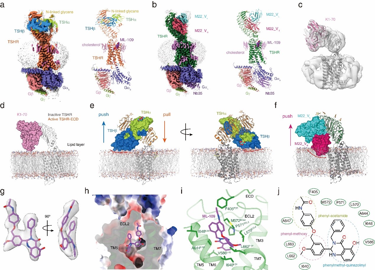 合作团队揭示了多个与促甲状腺激素受体(TSHR)相关的结构,包括内源性激素促甲状腺激素(TSH)和小分子激动剂ML-109与TSHR的结构,揭示了激素和变构激动剂诱导受体活化的机制,同时报道了TSHR与激活抗体M22和阻断抗体K1-70结合的结构,揭示了TSHR如何被自身抗体上调或下调的结构基础,从而为进一步开发针对该靶点的药物提供了结构基础和理论依据。