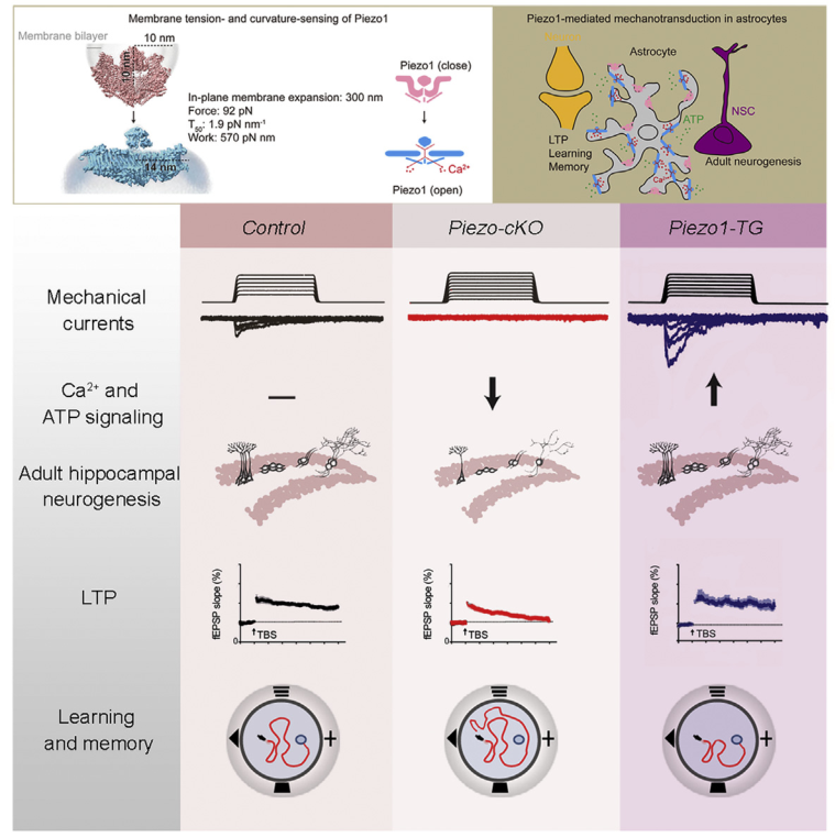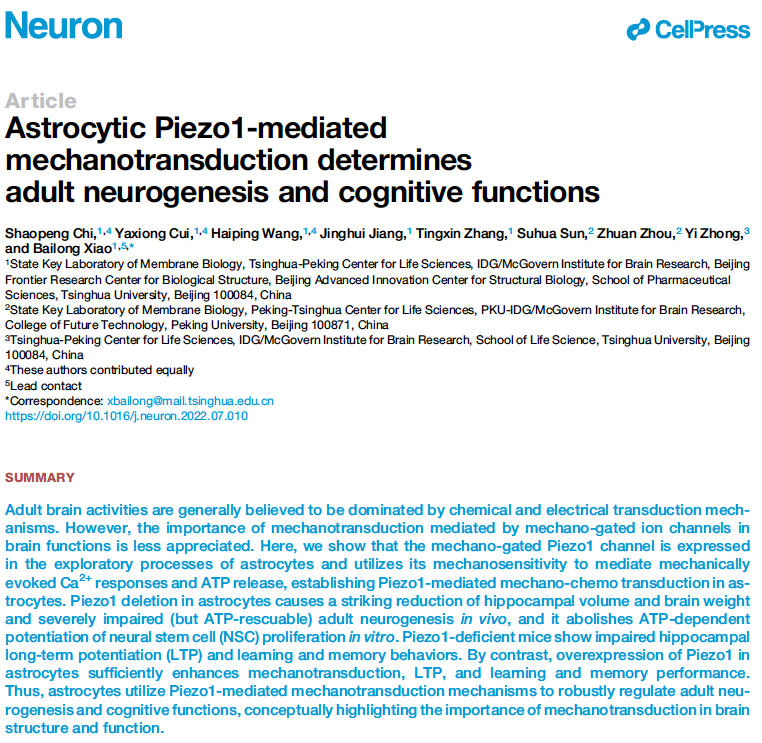 2022年8月12日, 清华大学药学院肖百龙团队在《神经元》 (Neuron) 杂志上,发表了题为《Piezo1介导星形胶质细胞的机械信号传导并调节海马成体神经发生和认知功能》(Astrocytic Piezo1-mediated mechanotransduction determines adult neurogenesis and cognitive functions)的研究长文,揭示了Piezo1作为星形胶质细胞的机械传感器,可以将机械信号转换成化学信号,通过影响ATP释放参与调节海马成体神经发生和认知功能的重要作用,为机械信号转导参与调控大脑组织稳态提供了证据。