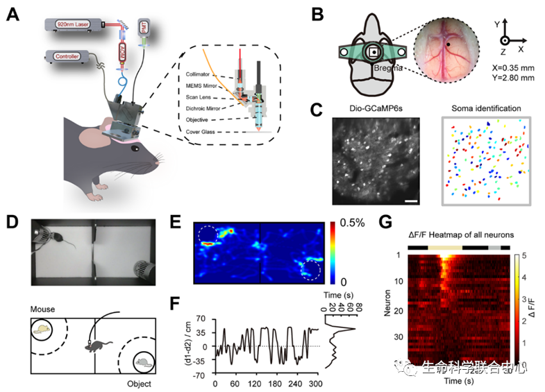 既往研究表明,大脑内侧前额叶皮层(mPFC)在社交探索、社交恐惧和社会竞争等方面均发挥重要调控功能[1-4]。当小鼠进行社交探索行为时,mPFC脑区前边缘皮质(PrL)内部分兴奋性锥体神经元活动会显著增强[5, 6],mPFC神经元集群在处理不同社交对象信息时,其活动表现出较强的异质性[7, 8],而且mPFC脑区内抑制性GABA能中间神经元也同社交行为密切相关[1, 4, 9],然而,由于缺乏在体单细胞分辨率水平、实时动态可视化的神经编码研究方法,这些不同亚型神经元集群是如何编码特定社交对象信息的尚不明了。