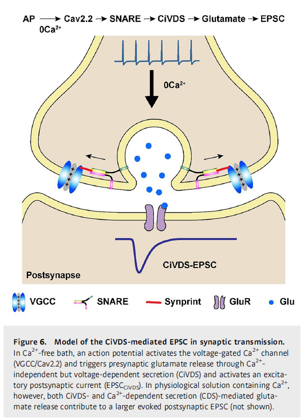 突触传导是神经系统中神经元之间信息传递的基础,是神经系统行使包括智能在内的一切生理功能的基础。自从1967年Katz等人提出神经传导的钙离子分泌假说以来,科学家们认为所有类型的突触传导都依赖于钙离子介导的囊泡分泌(CDS)。因为突触传导的重要性,钙离子假说相关的研究也因此荣获了3次诺贝尔生理医学奖并写入教科书中。周专课题组2002年在上海神经所首次报道在DRG感觉神经元胞体存在生理动作电位介导的CiVDS,2004年发现与CiVDS偶联的囊泡膜内吞,2004年课题组到北大工作,2009年报道神经胞体CiVDS分泌的生理意义,2017年揭示CiVDS产生的分子机理,2019年报道交感神经系统(交感神经和肾上腺)。至此CiVDS的最后一个重大基础问题是,它是否存在于基础神经科学的核心关注点突触传导(即神经元之间的化学“第二信使”完成的信号传导)。此次的研究结果表明在体外培养的小鼠脊髓的中枢神经网络中,生理性动作电位诱导的神经突触传导信号(EPSC)中不仅存在经典的CDS(占比<50%),同时也存在CiVDS(占比>50%)。课题组此次的发现极大地拓展了CiVDS的生理意义,因为突触传导在神经系统中起着关键作用,为排他性的经典(1950年以来)钙离子假说做出了重要的修正。