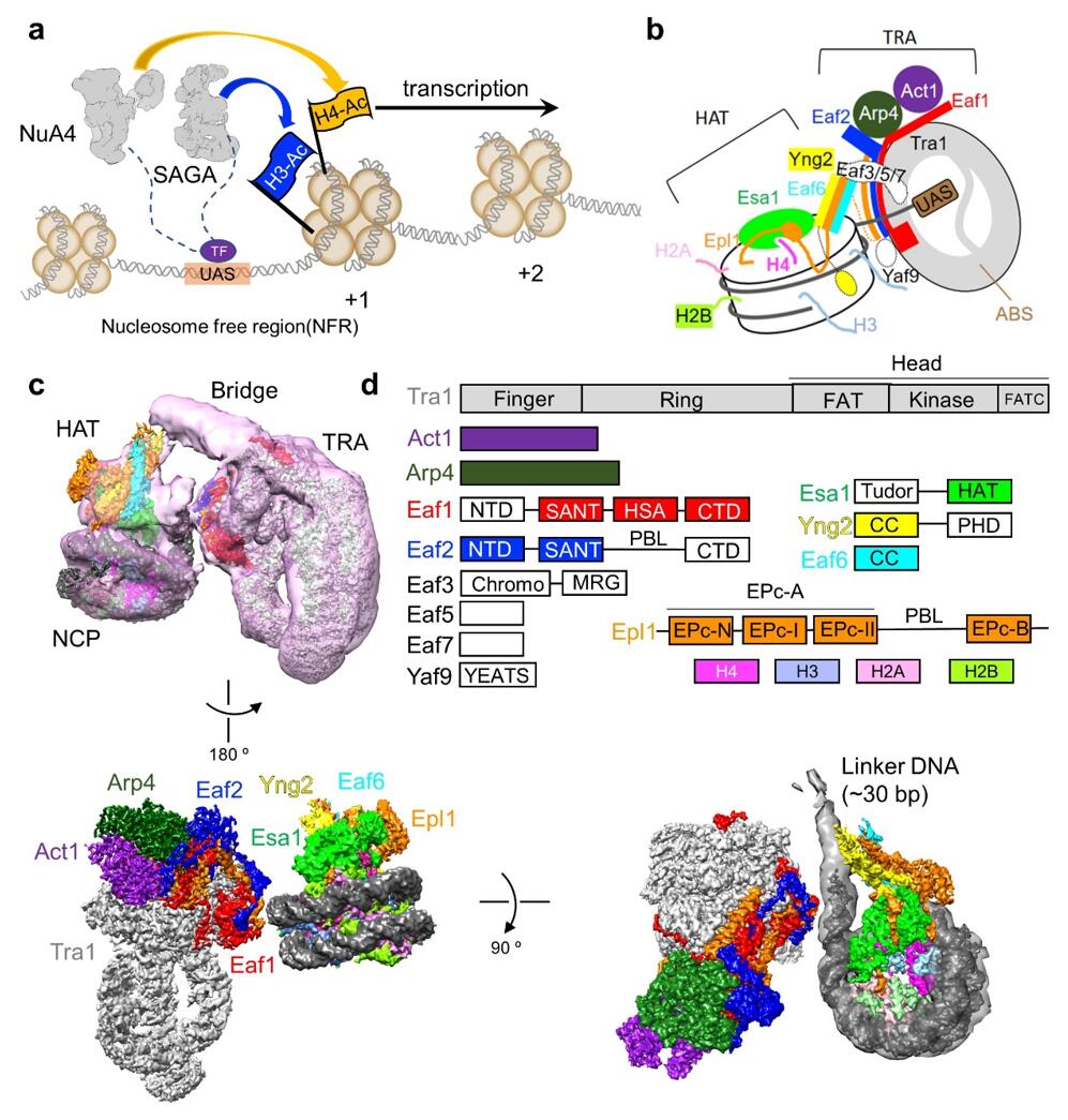 (a)NuA4与SAGA协同作用促进基因转录的工作模式图;(b)NuA4结合核小体的示意图;(c)NuA4-NCP复合物的电镜密度图。(d)NuA4各亚基结构域组成示意图,颜色与电镜密度图中一致。