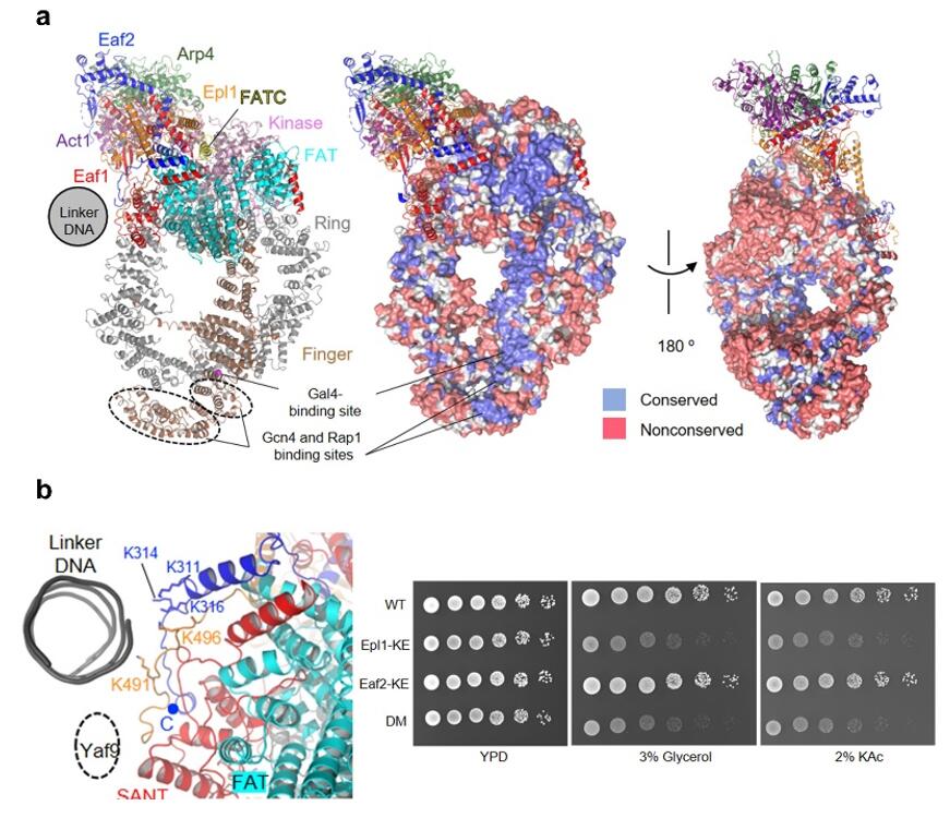 NuA4和SAGA是酿酒酵母两个重要的乙酰转移酶复合物,分别选择性地乙酰化组蛋白H4和H3,调控基因转录。NuA4和SAGA在不同物种中高度保守,前者是酵母生存唯一必需的乙酰转移酶。作为转录共激活因子,二者通过共同亚基Tra1,结合转录因子,被招募至启动子区(图1a)。因为有基础性作用,NuA4自发现至今20多年被不断研究,但其结构研究历史相当曲折,目前尚不清楚精细的分子组装模式以及识别底物核小体的机理。