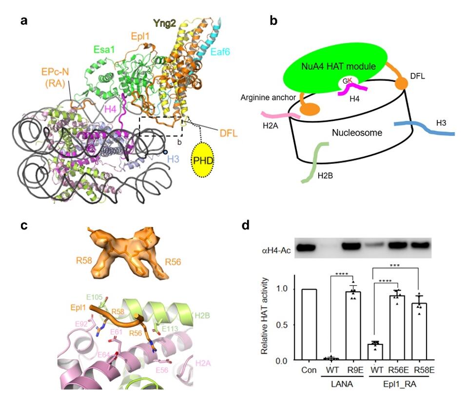 (a)HAT模块结合核小体的结构模型;(b)NuA4通过空间位置识别H4的模式图;(c)Arginine anchor局部电镜密度图及其与酸性区相互作用结构细节;(d)多肽竞争性实验显示Arginine anchor对NuA4乙酰化活性的重要性。