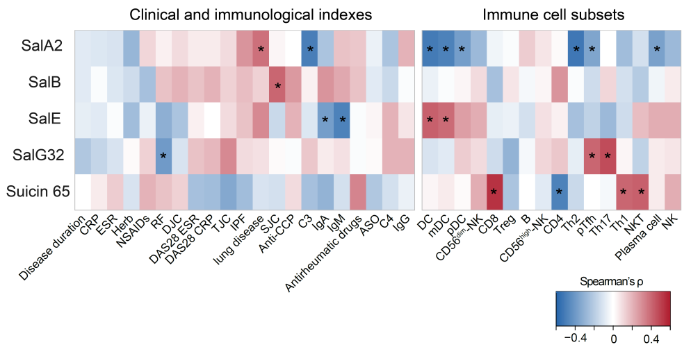 扁桃体菌群与肠道菌群类似,其微生态失调可导致局部免疫激活并诱发全身免疫反应。这是一项首次针对扁桃体菌群在类风湿关节炎发病中免疫机制的研究。作者使用宏基因组测序,发现类风湿关节炎患者扁桃体菌群明显异常,抗菌肽salivaricin的基因丰度显著减少,而且与外周血促炎免疫细胞如前体滤泡辅助性T细胞、树突状细胞以及浆细胞的变化显著相关。研究人员进一步通过体外实验证实salivaricin可显著抑制滤泡辅助性T(Tfh)细胞的分化和细胞因子IL-21的表达。同时,利用体外Pull-down、表面等离子体共振以及圆二色谱等技术,发现了salivaricin通过与IL-6和IL-21受体结合阻断IL-6/IL-21-JAK-STAT3信号通路的激活,可预防和治疗实验性关节炎。由此,本研究发现了扁桃体菌群在维持免疫平衡中的重要作用,以及抗菌肽salivaricin在类风湿关节炎发病中的免疫调节机制。