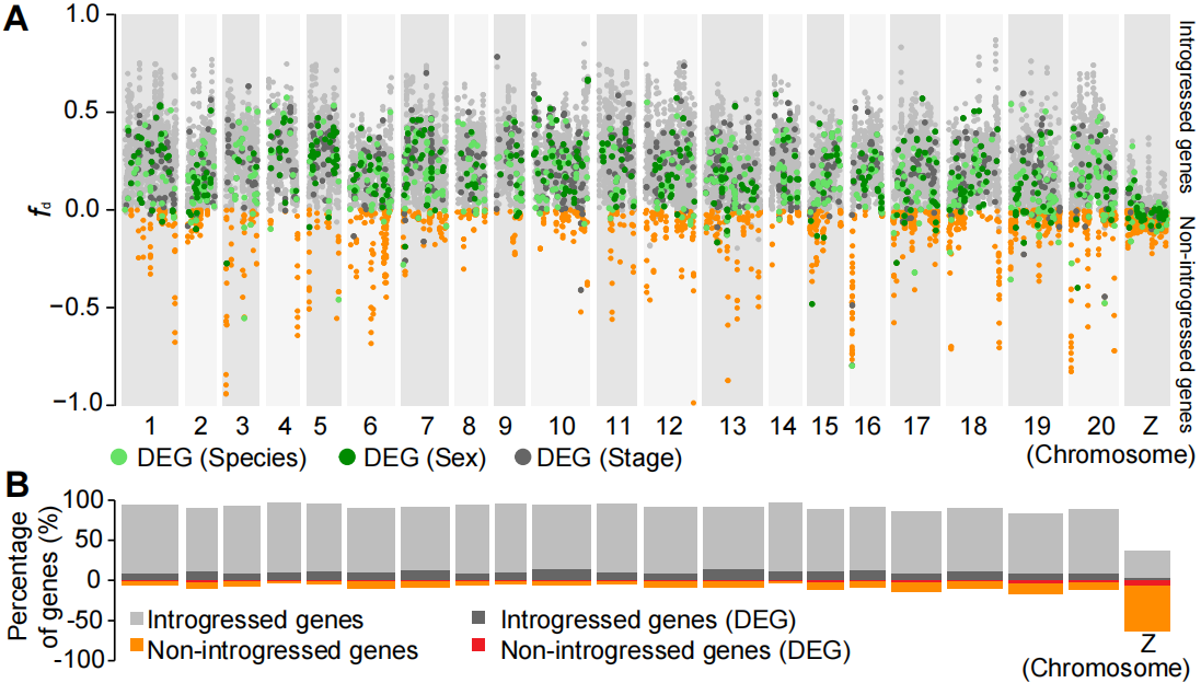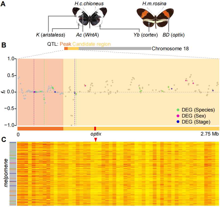 该研究通过整合比较转录组学和群体基因组学分析方法,发现了广泛的基因表达差异的证据,支持感受器官在物种屏障建立中的关键作用。通过与远亲物种Heliconius charithonia的比较,发现了感受多样性的增加与演化分化呈现一致的趋势。该研究的具体发现包括:揭示了触角的独特化学感受功能(图2);性染色体在种间分化中的重要性(图3);非渗入位点与拟态基因的强连锁性(图4);非化学感受基因在化学感受组织分化中不可忽视的作用。