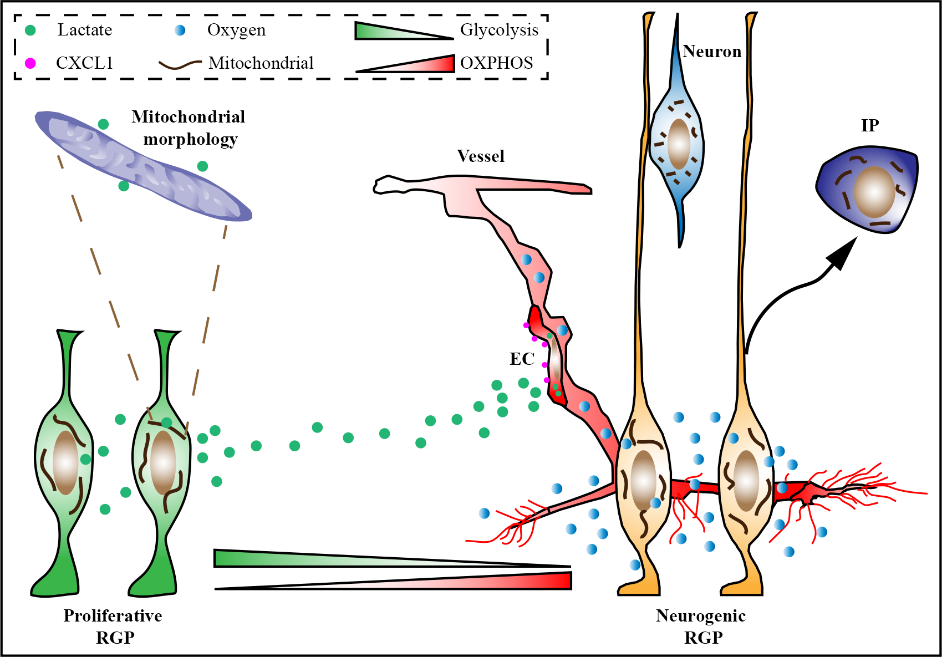 该研究基于单细胞代谢状态分析,首先观察到伴随RGP谱系发生过程的进行,RGP及其子代细胞具有不同的代谢状态。在此基础上,从基因表达、细胞代谢方式和代谢物积累三个方面展开研究,发现进行对称分裂的增殖型RGP会系统性高表达无氧糖酵解代谢相关基因和乳酸胞外转运子基因,表现出更强的无氧糖酵解代谢速率并合成和分泌大量乳酸;而进行不对称分裂的分化型RGP则选择性高表达三羧酸循环中的关键基因,表现出更强的氧化磷酸化代谢速率和乙酰辅酶A的积累。进一步研究发现在大脑新皮层发育早期,因增殖型RGP具有更强的乳酸合成和胞外分泌能力,使大脑新皮层组织内呈现高浓度乳酸微环境,促进了血管的生长。此外,乳酸代谢还可通过维持线粒体长度来增加RGP增殖性能,抑制或阻断乳酸合成代谢都会导致线粒长度变短,从而导致RGP过早分化。