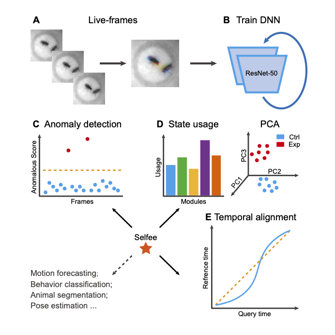 生命中心张伟研究员课题组开发了一种深度无监督学习方法(Selfee)来表征动物行为。该方法在行为分类问题上可以取得和经典的动物姿态估计特征相近的准确度。同时,此方法有效地避免了人工标记可能引入的主观偏差,并可以有效地表征低分辨率下的多个体大范围身体重叠的视频帧,极大地节约了人工成本。使用该方法提取的特征可被用于异常检测、动物行为模式分析和行为视频对齐等多种任务。分析结果可与进一步的行为实验结果相互印证。以上结果表明Selfee是一种有效的无监督动物行为分析方法。
