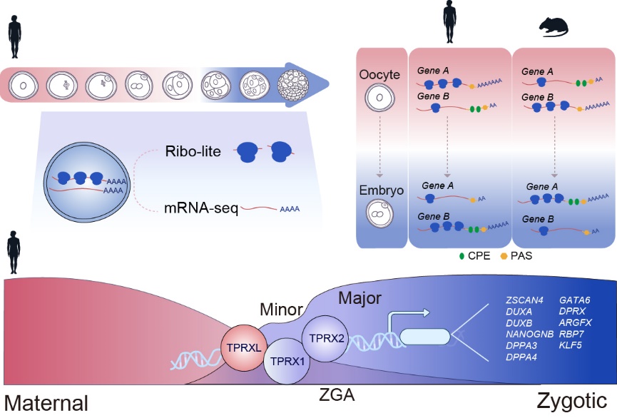 在哺乳动物卵子向早期胚胎转变的过程 (oocyte-to-embryo transition, OET) 中,翻译在减数分裂、合子基因组激活和早期胚胎发育过程中扮演了一个重要的角色。合子基因组激活 (human zygotic genome activation, ZGA) 作为生命起始时的第一次转录事件和启动胚胎发育进程的关键事件,在哺乳动物中仍未被完全理解清楚。尽管启动ZGA的关键转录因子在其他物种,如斑马鱼和果蝇等中被陆续发现,启动人类ZGA的关键转录因子仍然是一个未解之谜。