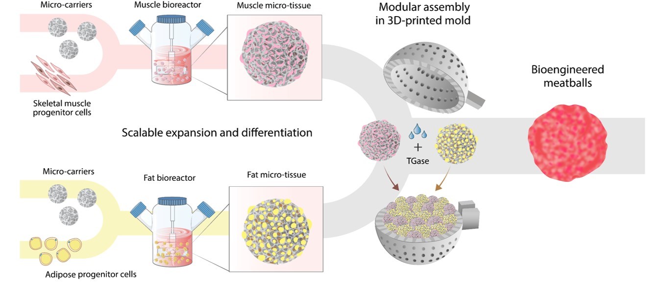 图1. 从细胞的规模化扩增到人造肉丸的组织工程学构建