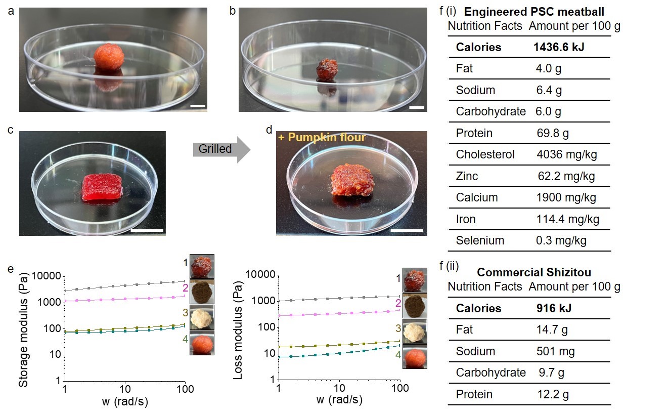 图2. 细胞培养猪肉制品在烹饪之前(a,c)和之后(b,d)的形态,以及与天然猪肉制作的食用猪肉丸(狮子头)的硬度(e)和营养成分(f)对比