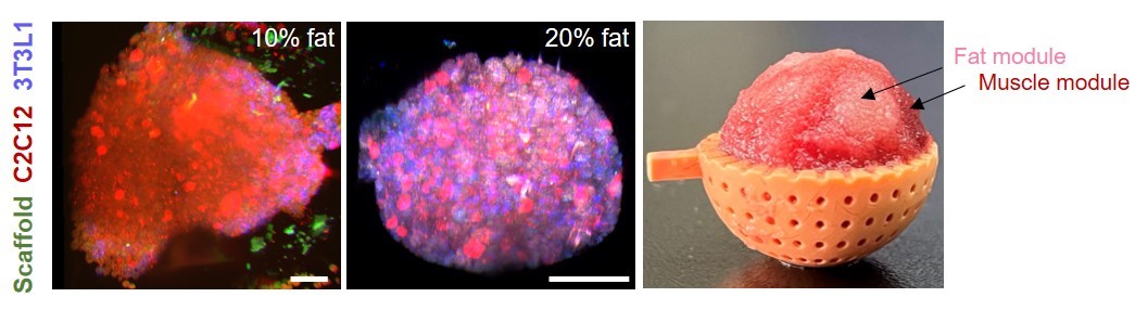 多孔明胶微载体也支持3T3L1小鼠脂肪前体细胞的扩增及进一步分化,10天内可发育成富含脂肪滴的脂肪细胞。将3T3L1脂肪微组织按一定的比例与C2C12肌肉微组织进行模块化生物组装,可进一步创造出“肥瘦相间”的人造肉丸 。