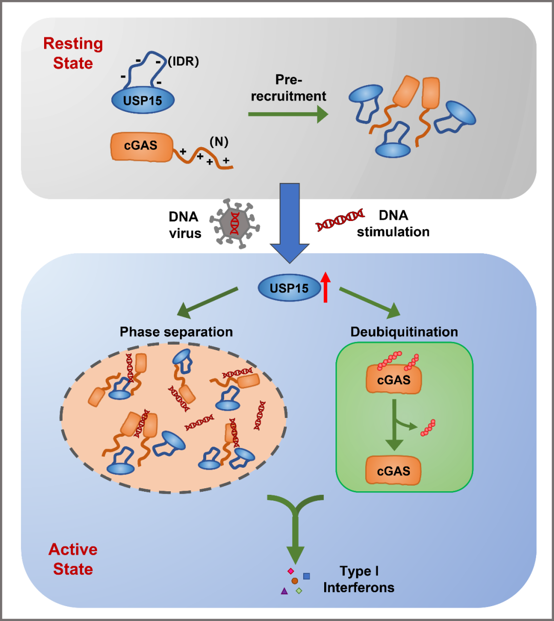 USP15介导的cGAS去泛素化修饰和增强相分离的过程促进了DNA引起的天然免疫信号,揭示了天然免疫通路中的全新的微调控机制。