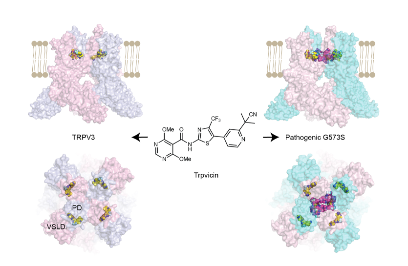 和TRPV1蛋白同家族的另外一个离子通道蛋白TRPV3 主要在皮肤生理和病理过程中发挥至关重要的作用。既往研究发现TRPV3 的功能障碍会导致多种皮肤病,例如Olmsted综合征(残毁性皮肤角化病),特应性皮炎(atopic dermatitis,AD)相关联的系统性瘙痒,以及脱发等。Olmsted综合征是一类罕见的皮肤病,病人可出现严重的皮肤角化和脱发,也是迄今为止发现的唯一一种伴有自发瘙痒的人类遗传病,是研究瘙痒的良好模型。此外AD是皮肤科疾病中病人群体最大的一种慢性炎症性疾病,皮疹会累及身体的大部分部位,伴有剧烈、持续的瘙痒,严重影响病人的生活质量。根据WHO数据,全球目前至少有2.5亿人受到AD的困扰。AD在7岁以下幼儿中发病率为25%,在成人中的发病率可以达10%。2012年,杨勇教授团队首次在Olmsted综合征病例中发现了包括G573S在内的TRPV3致病突变,并进一步探明TRPV3与特应性皮炎引起的皮肤瘙痒密切相关。然而由于缺乏高亲和力和高选择性的TRPV3小分子抑制剂,TRPV3 作为潜在治疗靶点的研究受到了严重阻碍。