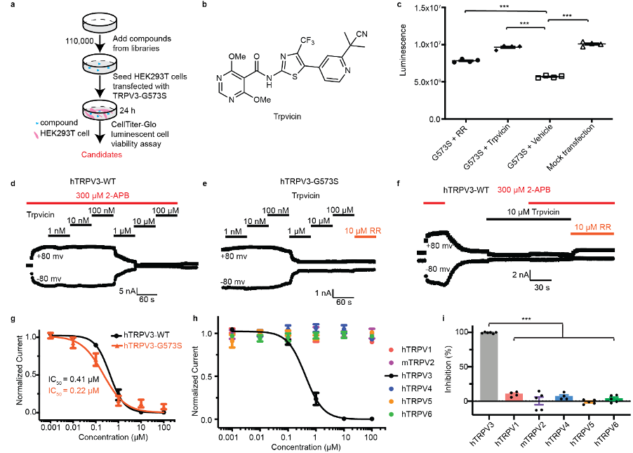 在该研究中,作者发现外源过表达致病突变体TRPV3_G573S会导致细胞死亡,并利用这一现象进行了小分子抑制剂的高通量筛选。通过筛选包含11万个化合物的分子库,作者最终鉴定出化合物Trpvicin是一种高亲和力TRPV3 拮抗剂(图1)。令人惊喜的是,Trpvicin对于同家族其他TRPV通道无明显的抑制作用,说明Trpvicin是一种潜在的具有亚型选择性的TRPV3抑制剂。