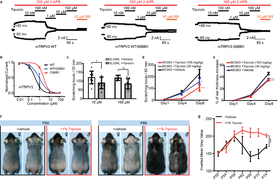 随后作者在动物模型上验证了Trpvicin 的效果,实验发现Trpvicin能够有效地缓解小鼠急性和慢性瘙痒;同时利用实验室建立的脱发动物模型对Trpvicin进行了测试,发现Trpvicin对于TRPV3突变引起的脱发,也有很好的治疗效果 (图2)。