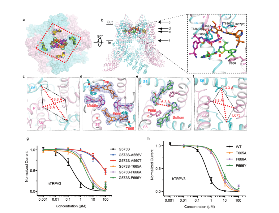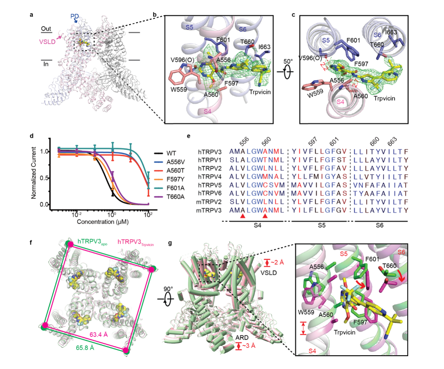 图3. TRPV3与Trpvicin的复合物结构揭示结合口袋和作用机制