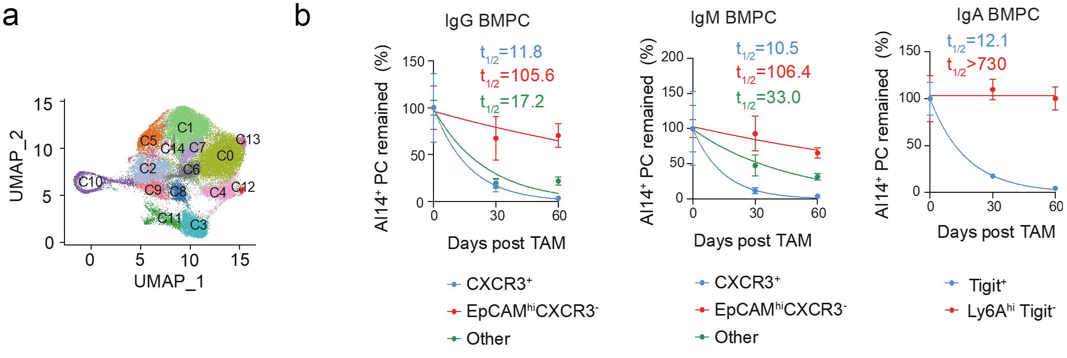 (a)基于转录组特征可将小鼠脾脏与骨髓浆细胞分为15个类群。(b) EpCAMhiCXCR3-的IgG与IgM型骨髓浆细胞以及Ly6AhiTigit-的IgA型骨髓浆细胞具有较长的半衰期,为长寿浆细胞类群。