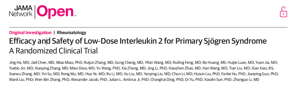 最近,北京大学人民医院、生命中心栗占国教授课题组在JAMA Network Open杂志发表论文“Efficacy and Safety of Low-Dose Interleukin-2 for Primary Sjögren’s Syndrome: A Randomized Clinical Trial”。作者通过一项严谨设计的双盲随机安慰剂对照研究(RCT),证明了低剂量IL-2(Ld-IL2)治疗原发性干燥综合征的有效性以及安全性。同时,对IL-2治疗干燥综合征的机制进行了探索,发现Ld-IL2可增强Treg细胞,而抑制干燥综合征相关炎性因子,为干燥综合征免疫靶向治疗提供了临床和实验依据。由此,Ld-IL2成为第一个经双盲安慰剂对照研究证明,达到临床治疗终点,在干燥综合征疗效显著的生物靶向药。
