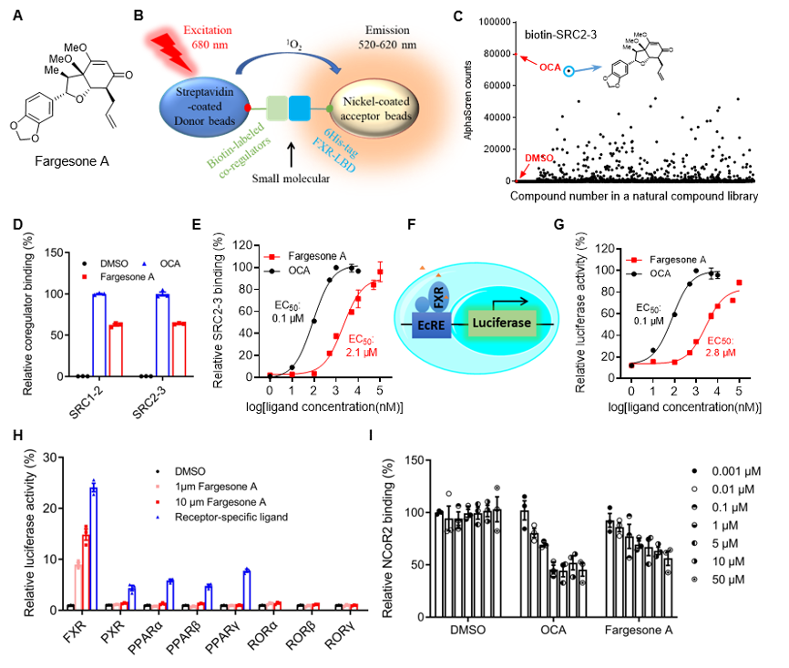 FXR的调节剂能够有效地调控FXR对辅调节因子的动态性募集和释放过程,利用这一特点设计了蛋白水平基于微珠的AlphaScreen高通量筛选体系,高效筛选了包含2700个天然产物的分子库,作者最终鉴定到来源于中药辛夷的天然产物Fargesone A是一种高亲和力的选择性FXR激动剂,能够在蛋白和细胞水平高效地激活FXR(图1)。