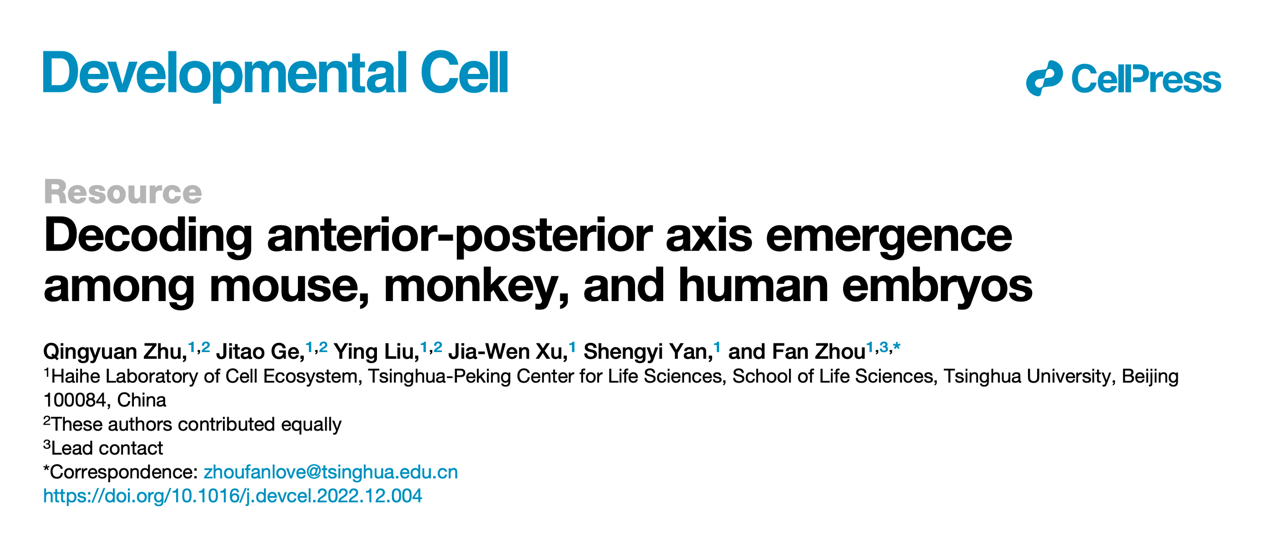 2023年1月9日,生命中心周帆课题组在Developmental Cell杂志在线发表了题为“Decoding anterior-posterior axis emergence among mouse, monkey, and human embryos”的研究论文。该研究结合高精度组学与拟时分析,空间分布验证等体系,发现小鼠前后轴形成的关键细胞群体DVE和AVE具有各自独立的起源与发育轨迹;跨物种对比显示非人灵长类与人类胚胎前后轴形成过程中则仅含有AVE细胞;现有基于干细胞诱导/重构的类胚胎模型中不含有前后轴相关细胞群体。