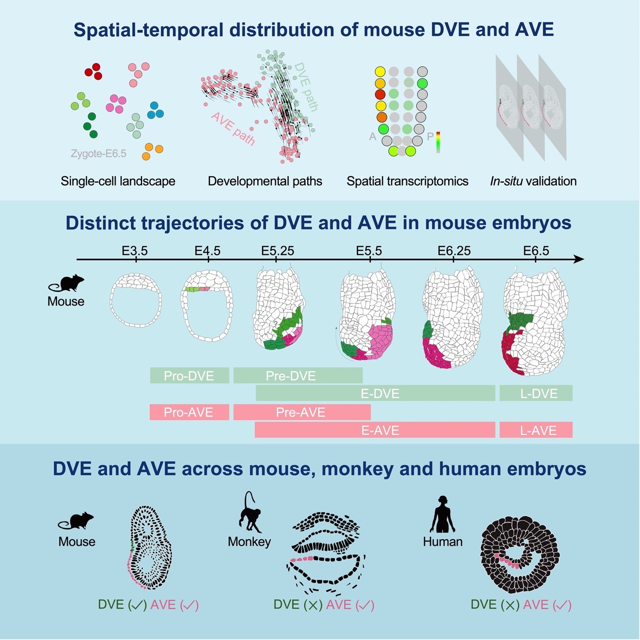 前后轴(anterior-posterior axis,AP axis)建立是哺乳动物胚胎发育中的重要事件,该过程的异常将导致胚胎着床后发育失败与流产。着床后,小鼠胚胎远端内脏内胚层(Distal visceral endoderm, DVE)从远端向胚胎单侧迁移,而后定位于胚胎前侧,形成前内脏内胚层(Anterior visceral endoderm,AVE)。AVE释放的信号分子作用于临近的上胚层(epiblast,EPI),促进其特化具有胚胎体前侧的特征,而对侧EPI由于远离AVE信号而特化形成原条,至此胚胎前后轴正式建立【1,2】。DVE和AVE作为前后轴形成过程中的关键细胞群体,经典理论倾向于认为它们是细胞迁移过程中同一类细胞的先后两种状态,即DVE是AVE的前体细胞;近年来也有研究提出DVE和AVE是同时存在的两类不同的细胞,且AVE可能来源于非DVE细胞【3,4】。为此,DVE和AVE具体的起源和特化模式,以及对应的分子调控规律有待进一步揭示。