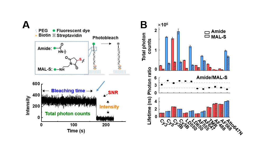 单分子荧光领域的研究者们发现通过MAL-巯基标记在蛋白上的荧光团的光漂白速度要比相同的标记在DNA上的荧光团显著加快。长期以来,人们将这一现象归于蛋白质上复杂的微环境加速了荧光团的光漂白。但八年前(2015年)陈春来课题组在实验中意外发现,即便是标记在相同序列DNA链上的相同荧光团分子,仅是NHS-氨基和MAL-巯基标记化学的差异,就会显著影响荧光团的光学特性和光漂白(图1)。进一步的测试发现,这一现象广泛存在于各类染料之中,无论母体是罗丹明类(Rhodamine)还是花青(Cyanine)类染料都会因MAL标记方式而造成约2-5倍不等的光稳定性下降(图1)。基于结果猜测,MAL标记形成的高活性的硫醚基团加速了染料的光漂白。