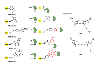 在荧光显微成像时,往往需要将染料精确特异地标记在目标生物分子,甚至特定的标记位点上。迄今为止,与氨基反应的琥珀酰亚胺(NHS)酯和与巯基反应的马来酰亚胺(MAL)是两个最常用且广泛商业化的标记模块,用于将有机荧光团共价连接到目标生物分子上。通常,NHS-氨基的化学被用于位点特异性地标记核酸和非特异性地标记蛋白质,这是因为含有氨基的赖氨酸残基在蛋白质中丰度较高。而含有巯基的半胱氨酸在蛋白质中的丰度较低,因而可以通过蛋白定点突变移除内源性的半胱氨酸并在标记位点引入半胱氨酸,利用MAL-巯基标记化学实现蛋白质上的位点特异性标记,这一标记方法在单分子荧光和单分子FRET技术中的应用尤为广泛和重要。