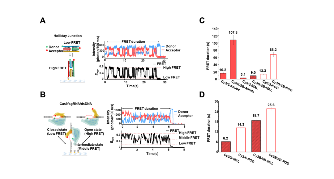 近二十年来,基于荧光显微镜和荧光染料技术的迅速发展,科学家们能够以前所未有的时空分辨率来观测生物分子的位置、动态与功能。大多数荧光成像技术,如单分子荧光共振能量转移(smFRET),单分子追踪,单分子定位显微镜(SMLM),受激辐射损耗(STED)显微镜和MINFLUX显微镜,对于染料一个核心诉求便是让每个荧光团分子在光漂白前发射出更多的光子,即提高荧光染料的光稳定性,以实现长时程、高时空分辨率的成像。