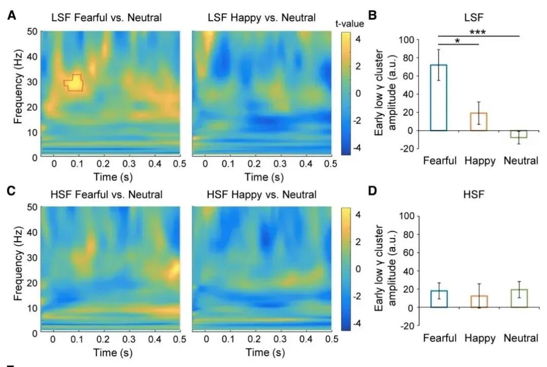 为解决此问题,本研究采用了颅内立体脑电图(stereo-electroencephalogram, sEEG)的方法,直接记录癫痫患者杏仁核及皮层通路多个脑区对情绪面孔的神经反应;并使用后向掩蔽技术意识下呈现情绪面孔,以阻断情绪信息在皮层通路的传输(图1)。行为研究结果发现,被试对于情绪面孔的辨别能力处于几率水平,说明实验中大脑对情绪面孔处于无意识加工(unconscious processing)的状态。运用sEEG技术,团队发现,人类杏仁核仍然对意识下恐惧面孔有选择性加工,且杏仁核的选择性反应发生在90ms以内(图2),早于皮层视觉通路对杏仁核的信息传递。进而,时频分析结果发现,杏仁核对意识下恐惧面孔有选择性反应能量主要源自Gamma频段(27-33 Hz)(图3)。
