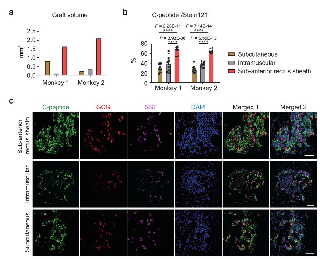 研究人员还证实,hCiPSC-islets移植后,内源胰岛素分泌水平大幅提升,且能够响应血糖浓度变化;与肝脏门静脉移植相比,新移植方案胰岛素标志物(C肽)分泌水平提升5倍以上,其中一只糖尿病猴C肽分泌水平达到了健康人的水平。这个结果表明,未来在人多能干细胞分化胰岛细胞临床移植中,接受腹直肌鞘下移植有望使糖尿病患者完全脱离胰岛素注射,实现1型糖尿病的治愈。
