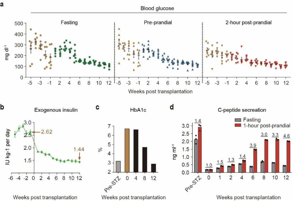 研究者将hCiPSC-islets输注到糖尿病模型猴腹直肌前鞘下,所有接受移植的糖尿病猴的血糖控制都得到了显著改善(图3)。从移植后第6周开始,空腹血糖、餐前血糖以及餐后2小时血糖下降至10mM以下。移植后12周,糖化血红蛋白(HbA1c)平均下降44%,到达健康猴水平;同时,外源胰岛素输注量下降43%。