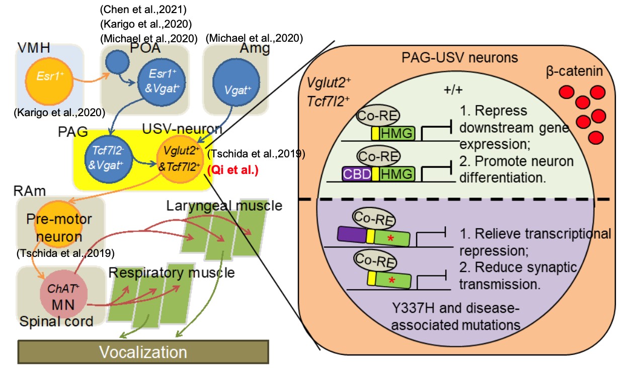 声音的产生需要躯体多个部分相互协同作用,如喉部肌肉,呼吸以及横跨前脑到脑干的神经网络等。中脑导水管周围灰质(Periaqueductal gray, PAG)是大脑中一个比较保守的结构,在小鼠,猫以及非人灵长类动物中被认为是控制先天性发声的一个重要节点。因此,许多对发声的研究围绕在以PAG为中心的上下游的神经环路上,然而,对于PAG控制发声的分子调控机制却鲜为人知。