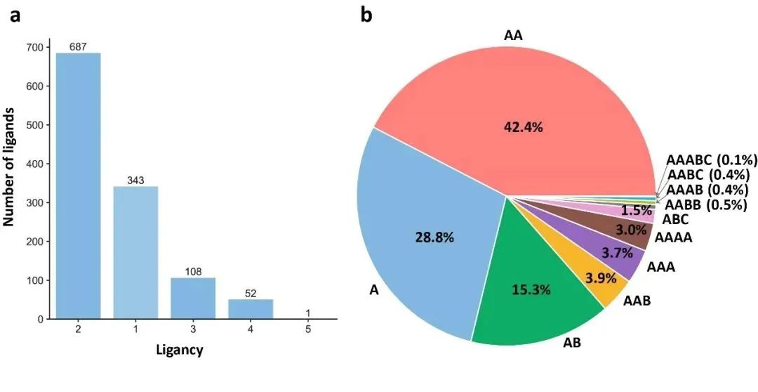 图1. 别构位点在蛋白质拓扑图中的分布。(a)别构配体的配位数的分布。(b)别构配体结合的结构域的类型分布。一个字母代表一个结构域,相同字母代表相同fold类型的结构域。